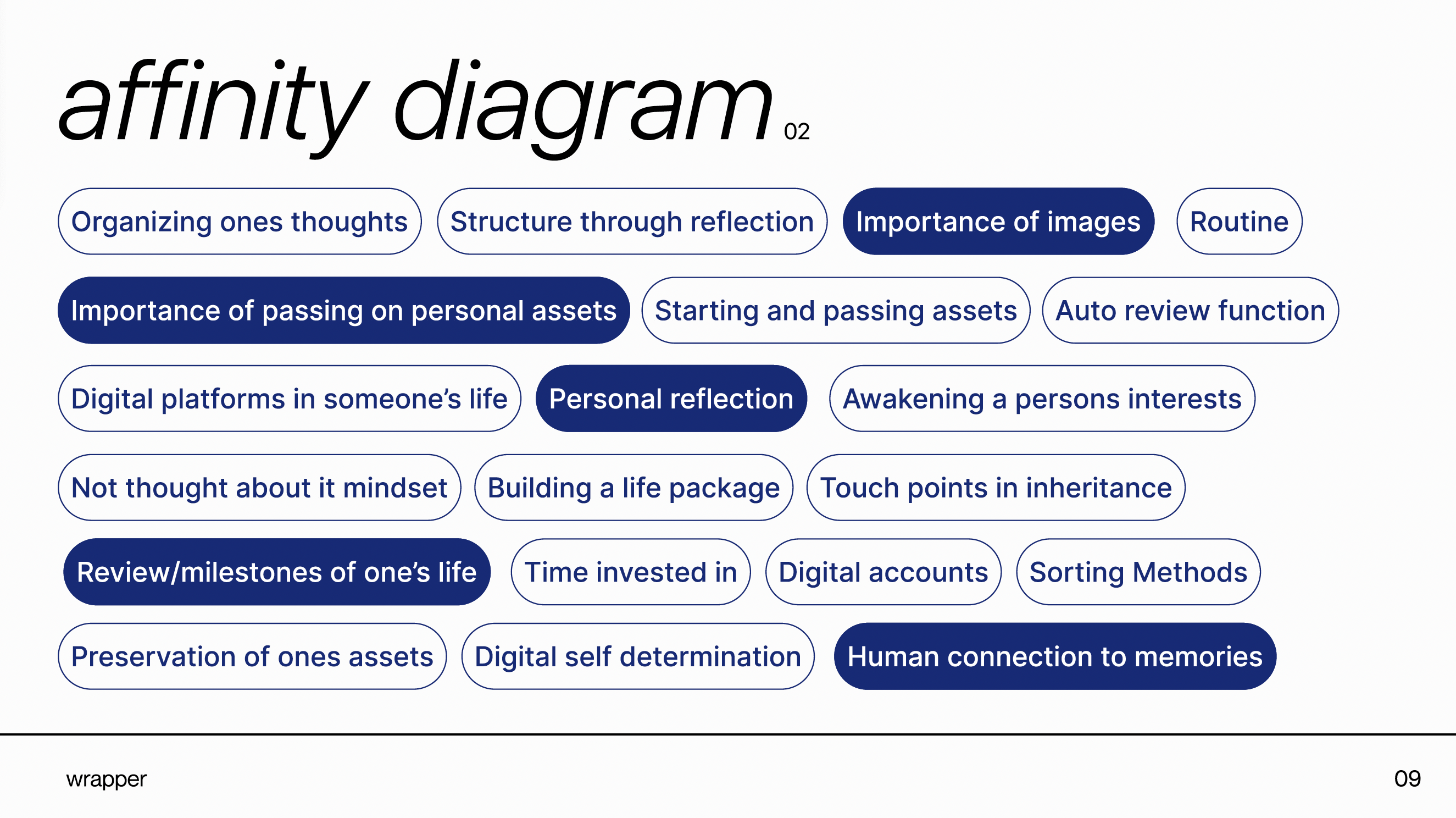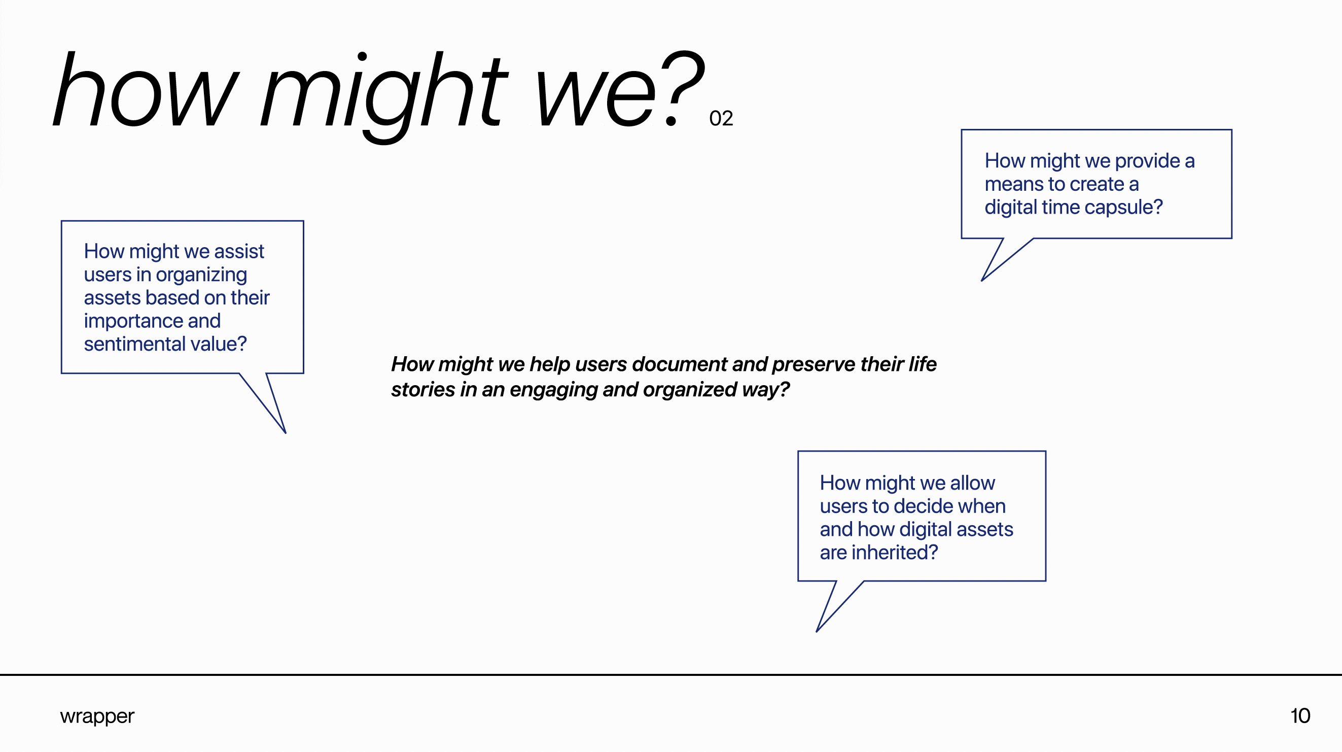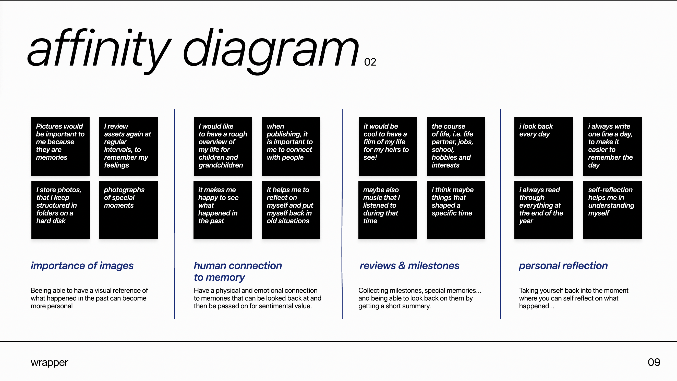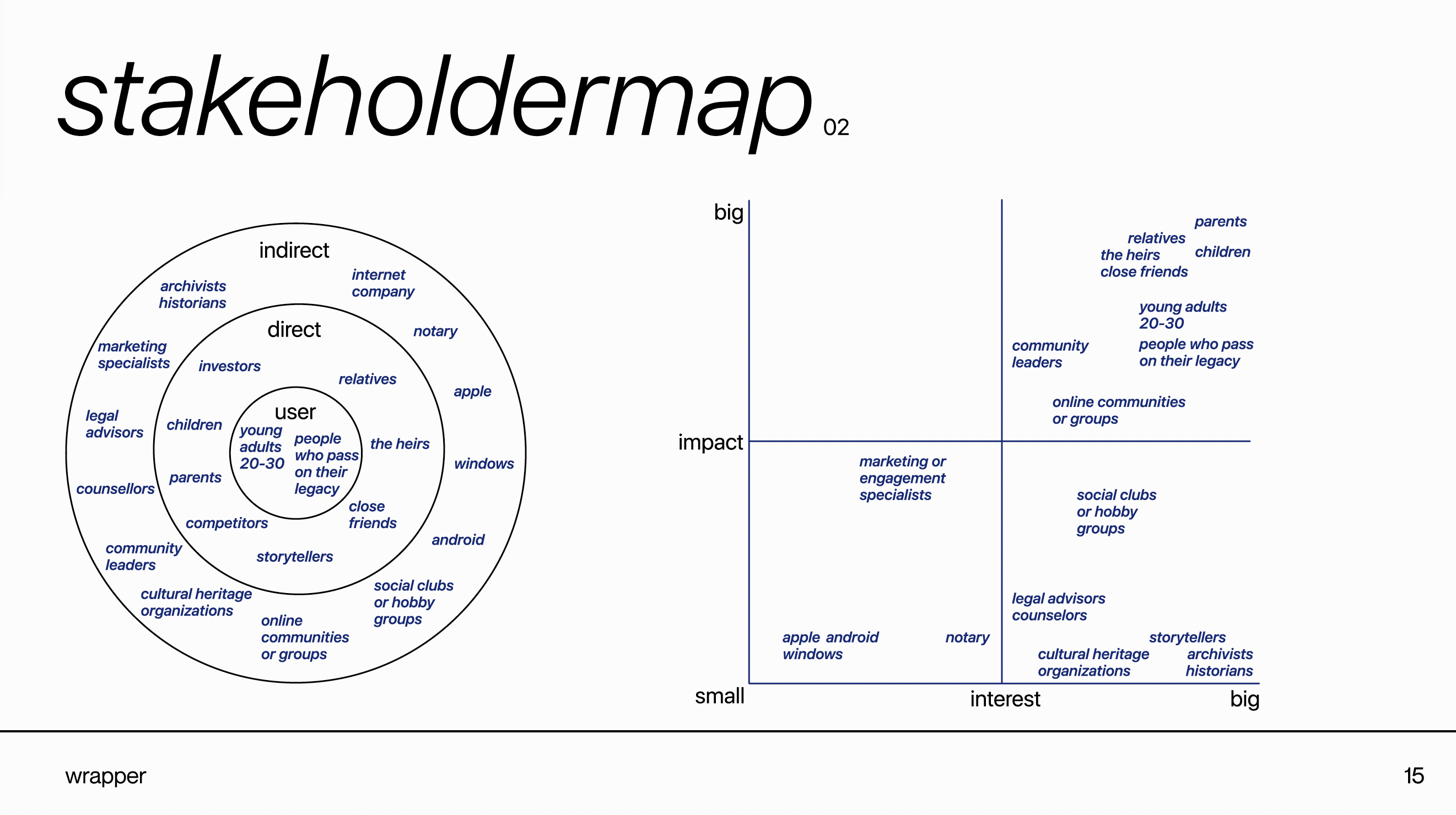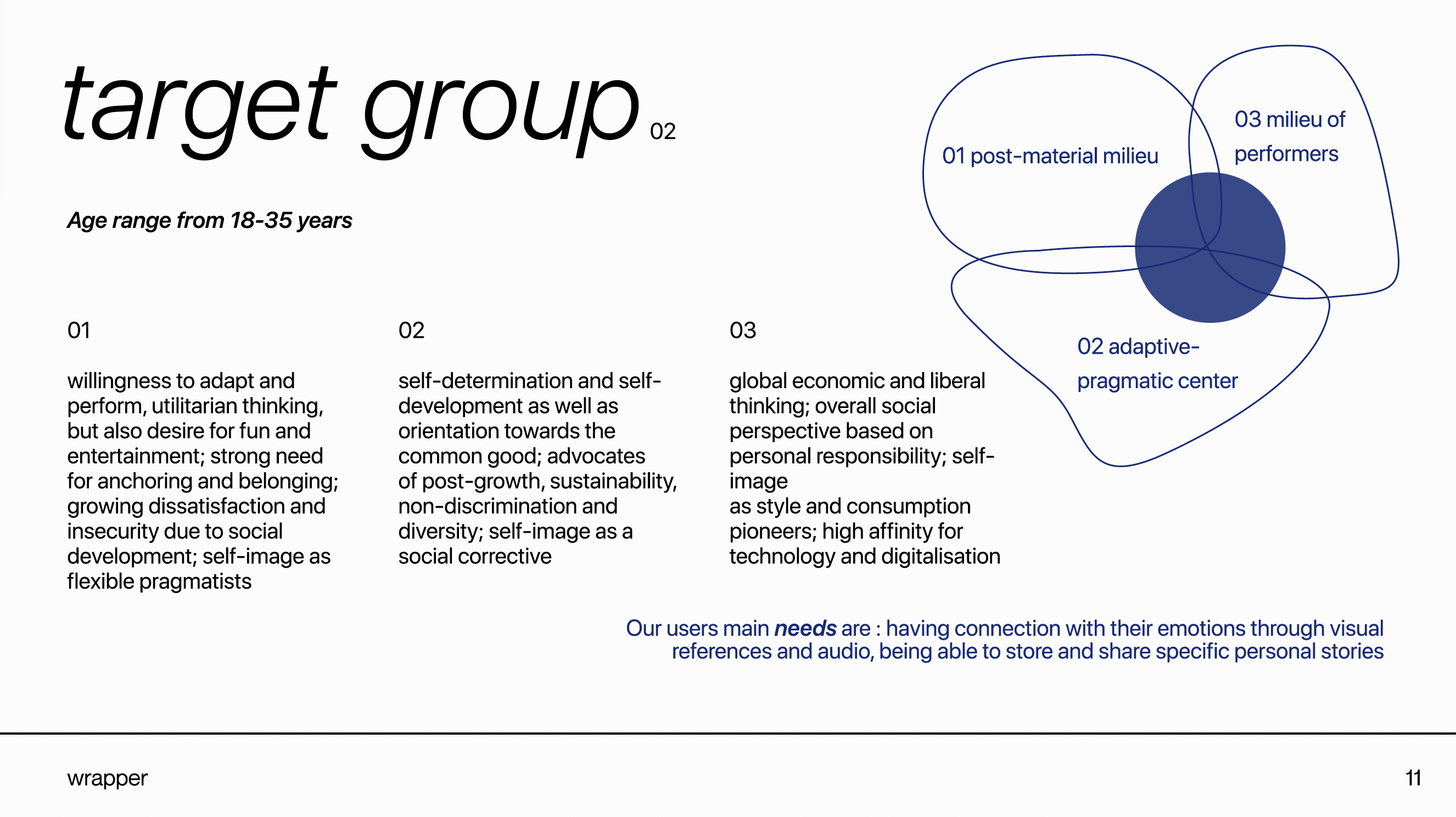 "Wrapper" makes it possible to preserve life moments in unique wrappers to share and inherit them with loved ones at a specific time. By linking to various applications, the app collects all important digital content. The use of tags makes it possible to react and ensure that every moment is remembered clearly. Various filters can be used to search for specific wrappers. And the editing function makes it possible to adapt or optimise them afterwards.